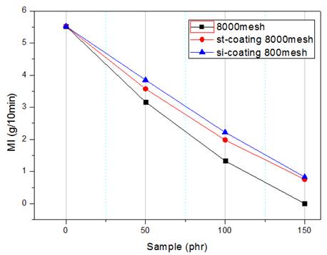 使用硬脂酸和硅烷改性后對熔體流動速率有顯著提升,硅烷效果優(yōu)于硬脂酸