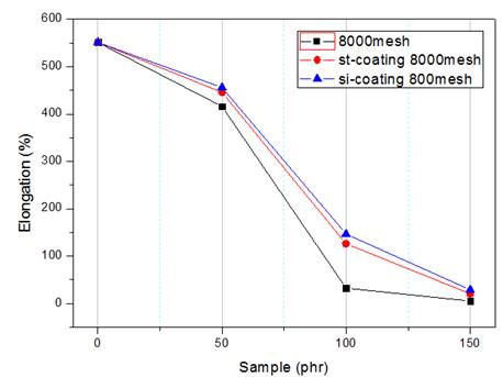 使用硬脂酸和硅烷改性后對斷裂伸長率有顯著提升,硅烷效果優(yōu)于硬脂酸