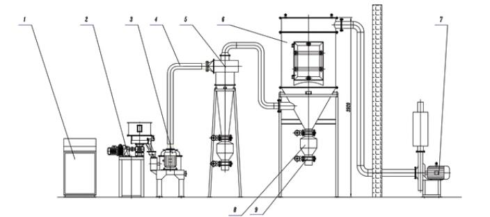 1. 控制柜 2.加料機(jī) 3.粉碎機(jī) 4.管道 5旋風(fēng)分離器 6.收塵器 7.風(fēng)機(jī) 8.儲料罐 9.排料閥(可選非金屬襯套型)